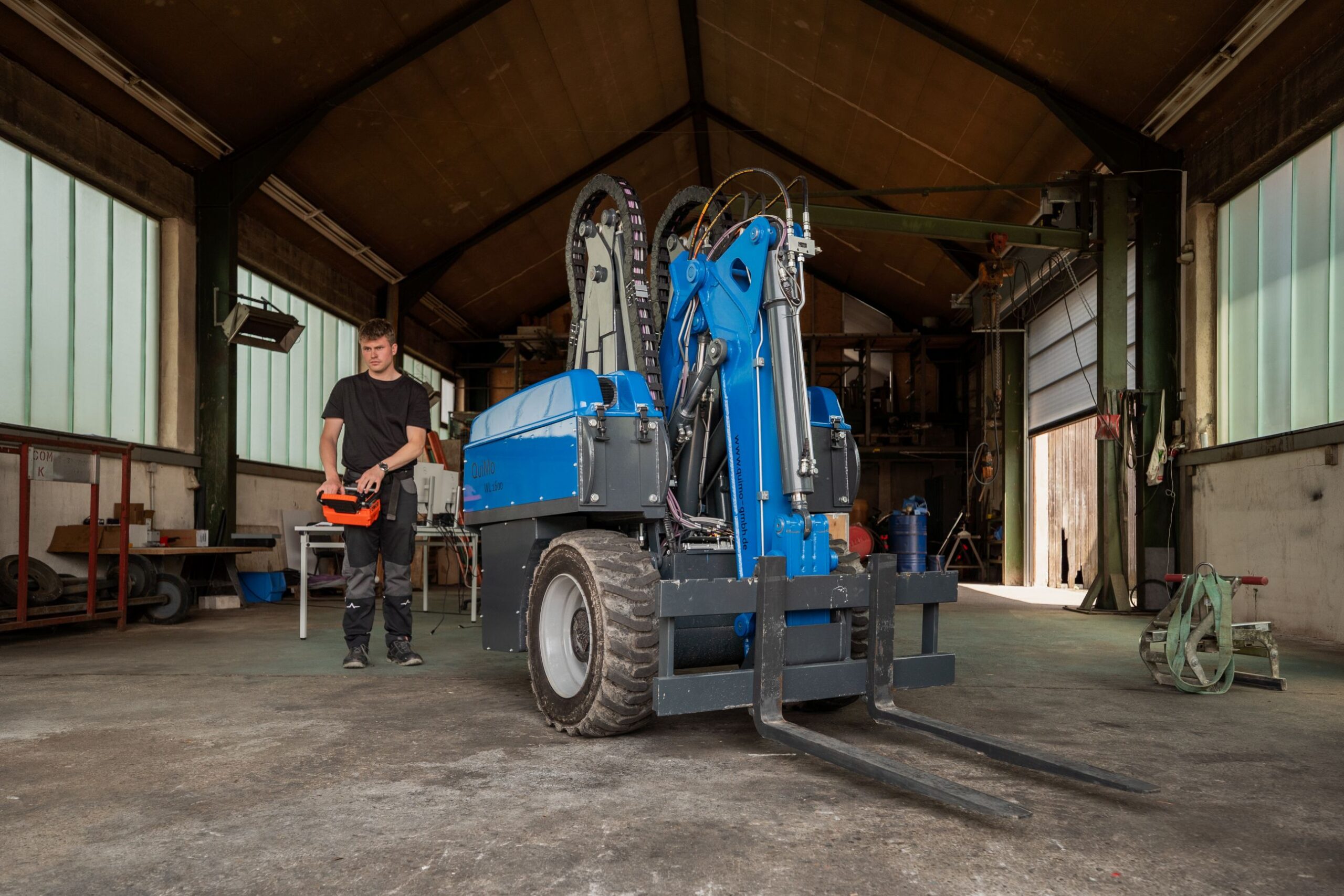 Jonas Heinzler bei der Bedienung des QuiMo WL 1600 mit einer Fernsteuerung